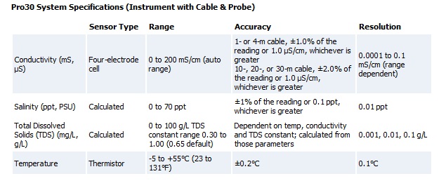 The Pro30 provides everything you need in a handheld meter that measures salinity, conductivity, specific conductance, total dissolved solids, and temperature. Rugged, simple and reliable.